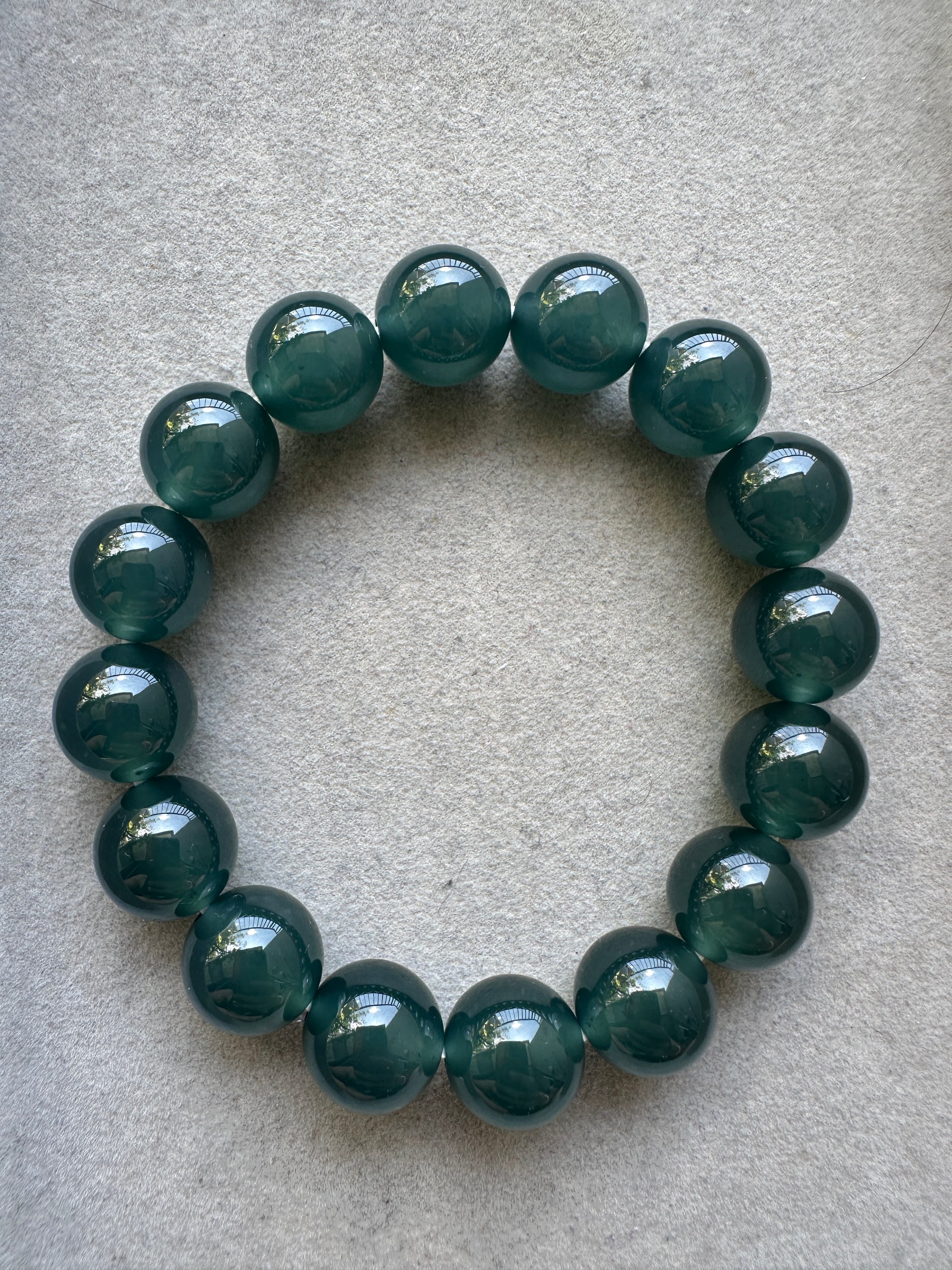 A captivating beauty from the Guatemalan type. This Guatemalan jadeite jade has an excellent texture with a good iciness that gives off a good translucency. The colour of the jadeite bracelet is also intense that depicts the colour of a deep lake. Each of the beads are carefully carved with each being uniform in size. No unwanted cottons and crack lines can be seen.