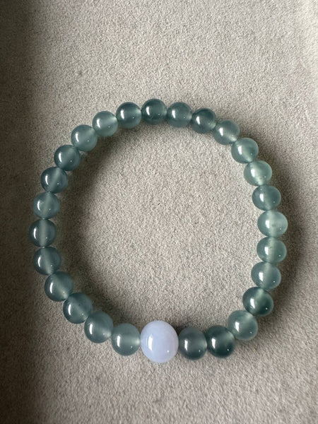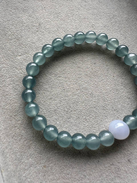 Walking down the memory lane. May each of the beads filled with the memory of your loved ones. Each of the beads from this bracelet is selected with care. The beads of the bracelet derived from the high quality Guatemalan jadeite that produces its signature blue and icy quality seemingly like the Burmese blue water jadeite. Texture of the beads are very fine with no unwanted cottons present. None of the beads have seeable cracks or imperfections. Accompanied by a lustrous lavender bead that adds as an accent to the whole bracelet.