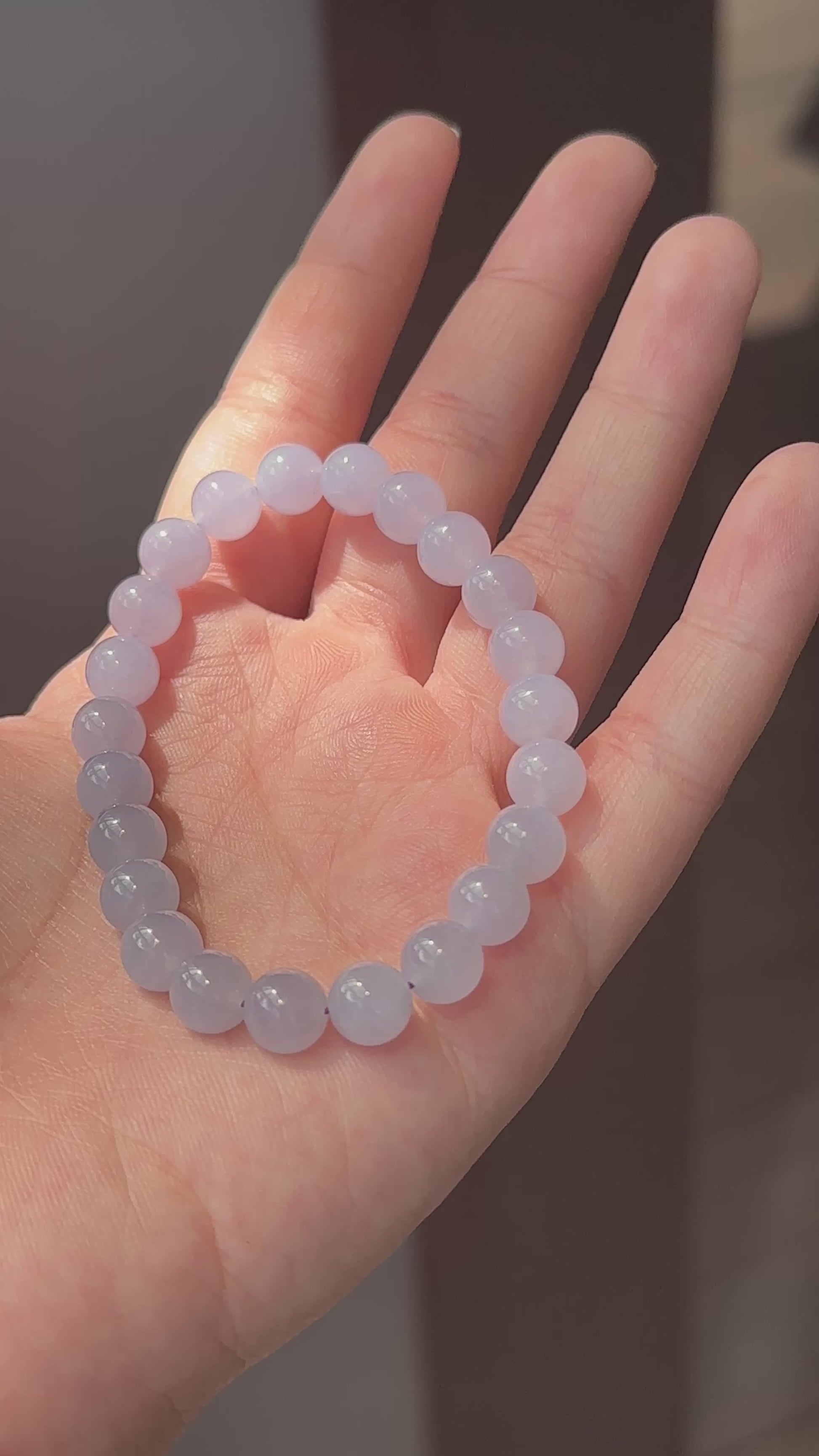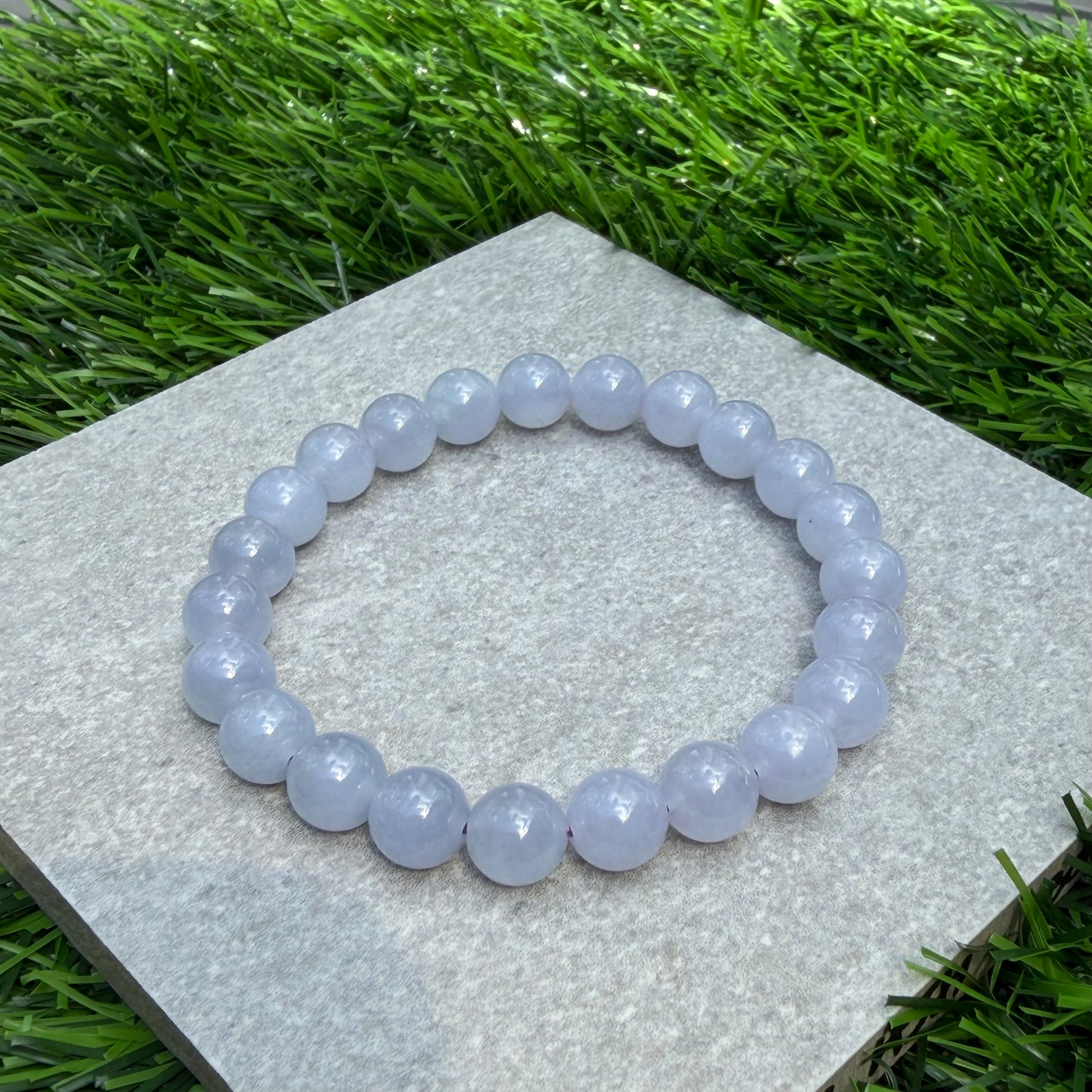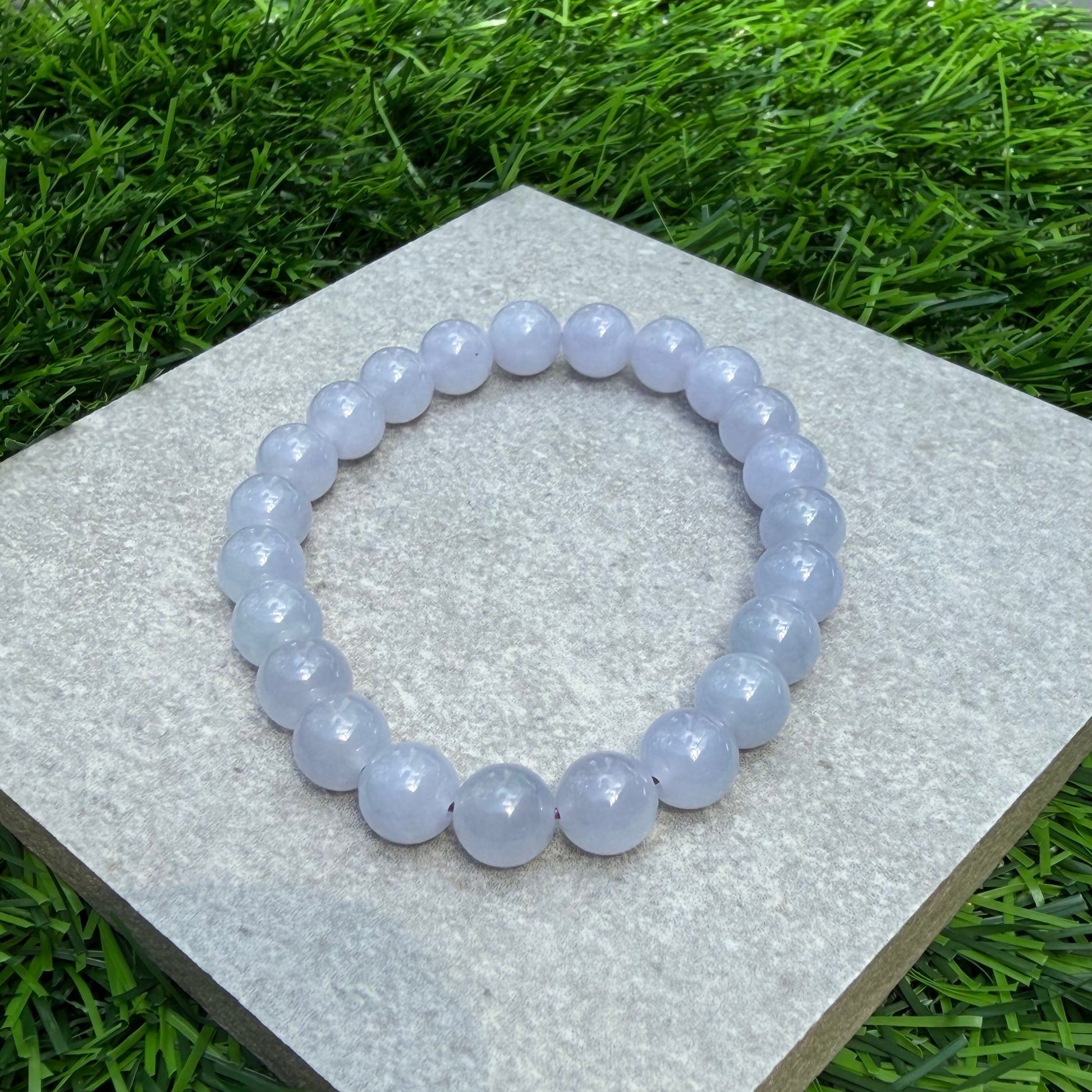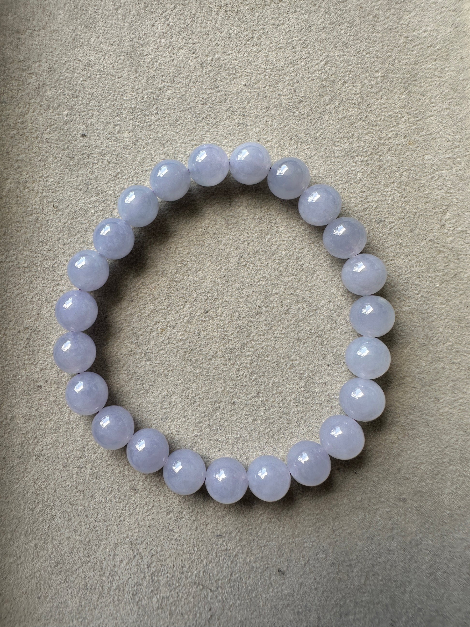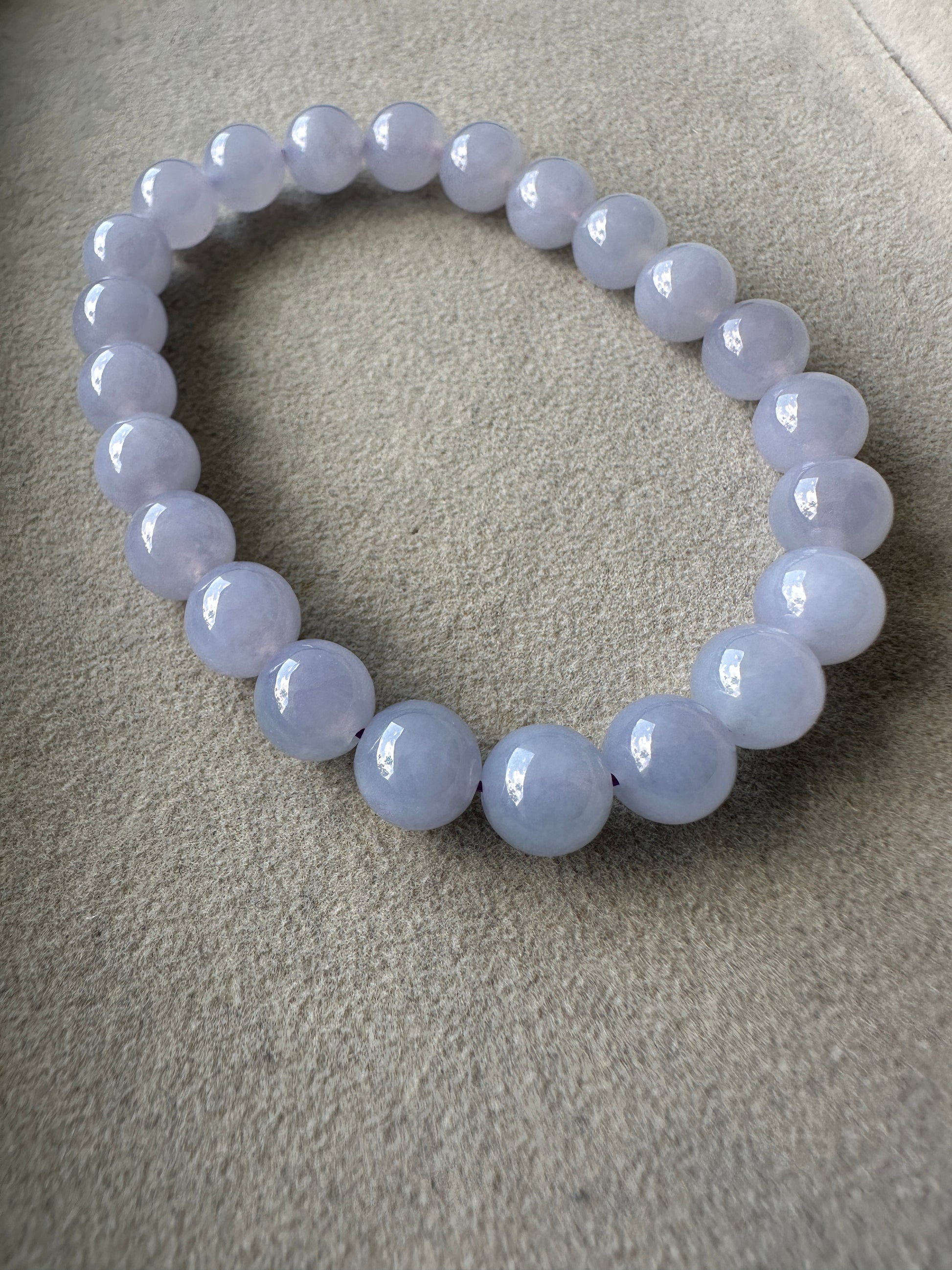 The ever popular lavender jadeite. A piece seemingly like a battery full of youth. This blissful lavender jadeite beads bracelet exudes youthful aura. Carries icy and smooth texture with strong purple that does not fade with sunlight. No major cracks or lines can be seen on each bead; nearing perfection.