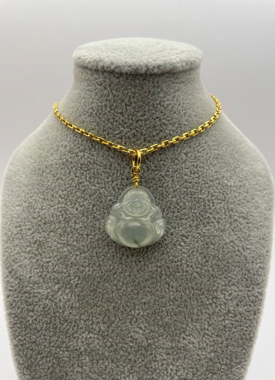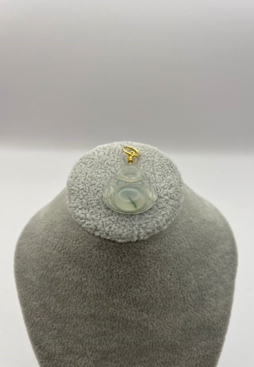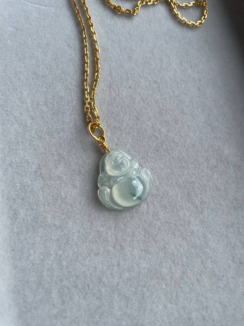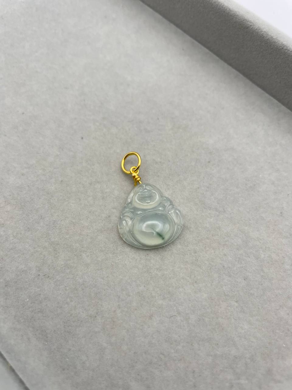 With a simple 18k gold hook setting, this dainty jade Buddha pendant can be quite mesmerizing. A stroke of deep green marbling acts like a finishing touch to this piece with a rather thick belly for a small buddha. Very fine texture and high transparency. A great piece for ladies or for novice collectors! The last picture was taken under natural lighting. **Gold chain not included**