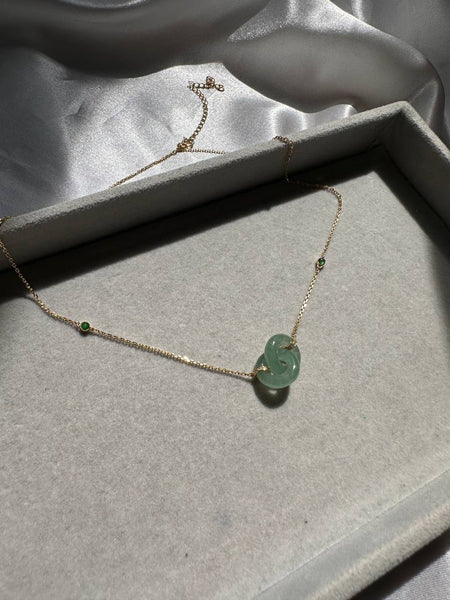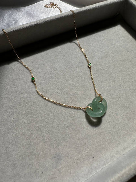 A requested design from our client. Double loops are often represented as interlocking love giving the symbol of infinity love. A delicate hand carving method is needed to make the double loops interlocking each other. The two tiny green stones are also natural jadeite cabochons. The double loops are set in 18K yellow gold chain with natural diamonds embedded at the locks of the loops at each end. The length of the necklace is also adjustable between 43cm to 50cm. The cabochons are 3cm and 5cm apart from the loops respectively to add in depth and dimension to the overall design.