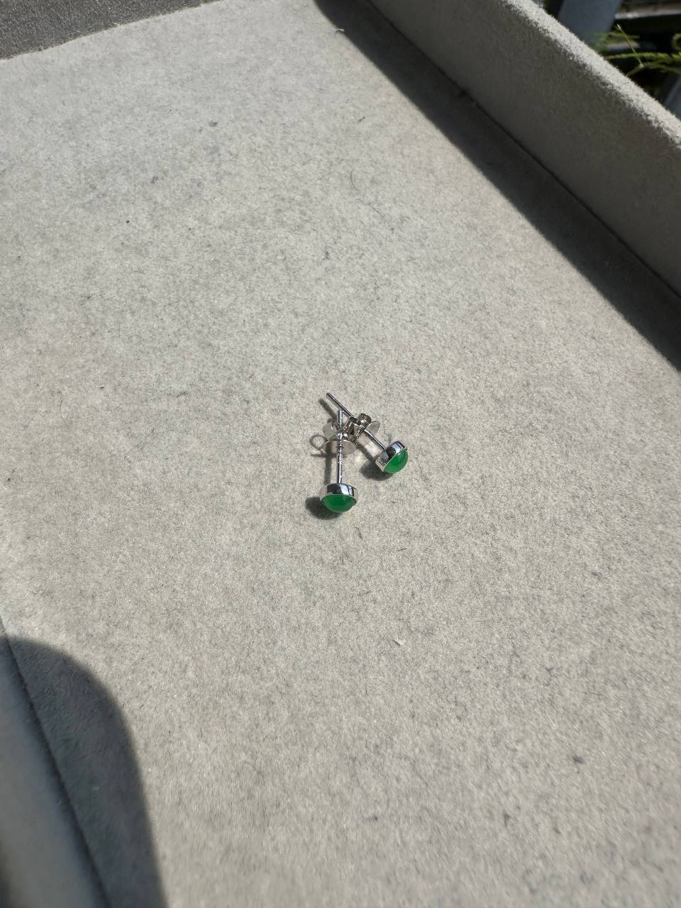 A minimalist approach, these pair of Burmese Grade A Jadeite Jade cabochons are perfectly set in 18K White Gold. Small but powerful, these two jadeite cabochons comes in icy and fine texture with a rare sunny green. No cracks and line can be found on each cabochon. These pair of jadeite jade earrings is perfect for those looking for poise and elegance for everyday wear.