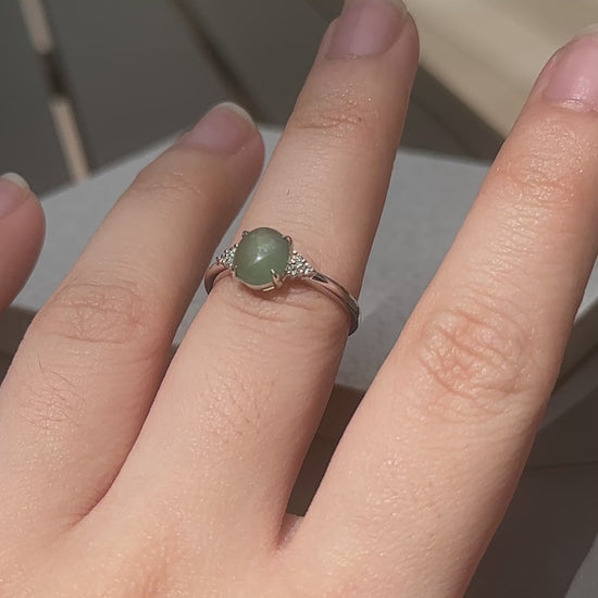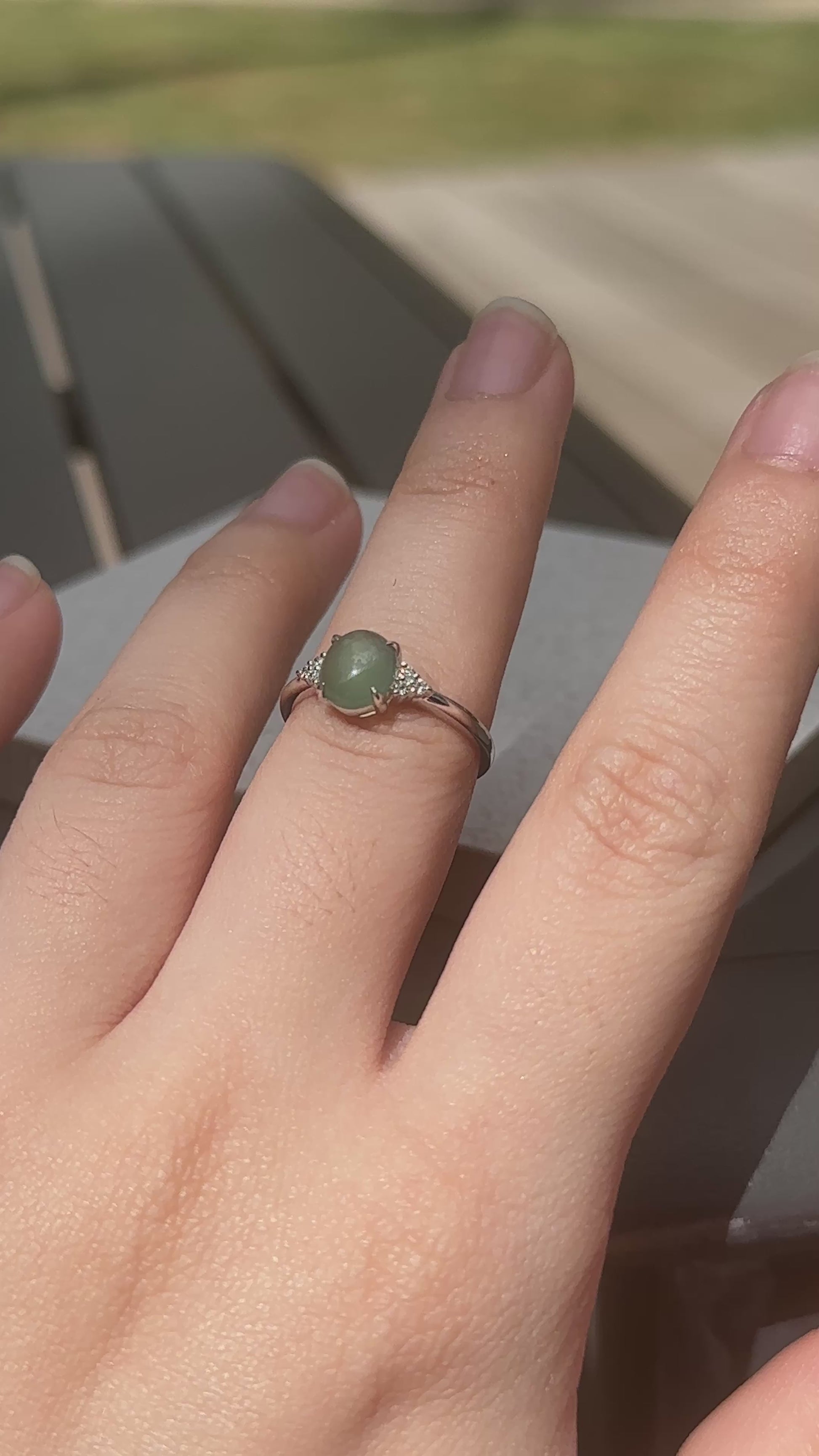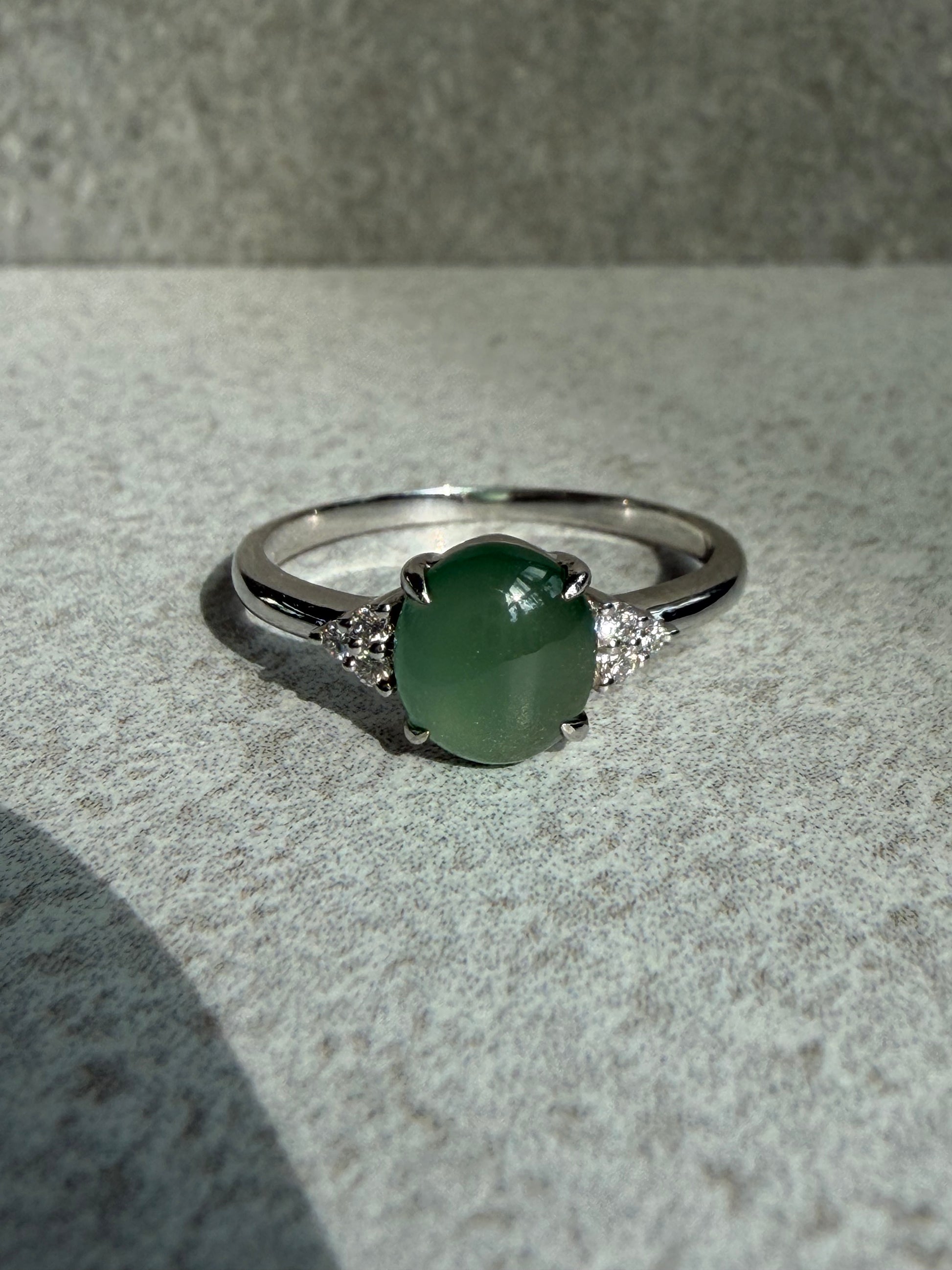 Seemingly like a drop of water from a deep lake in spring. This icy jadeite cabochon has a very icy and clear texture with no flaws. A deep blue in colour that many jadeite collectors favours. Set in 18K white gold with six natural diamonds with three each on each side. This ring provides those who seek calm, serene, and grace which jadeite offers