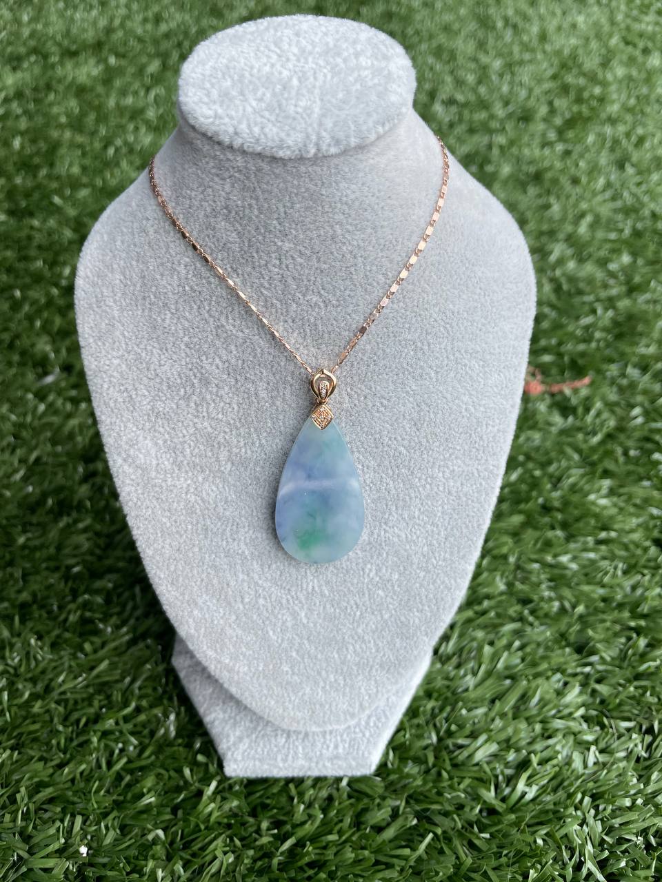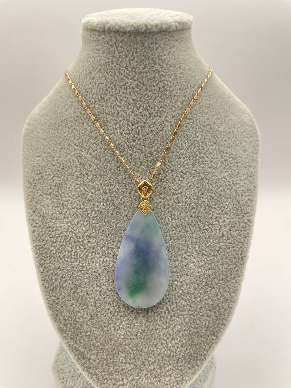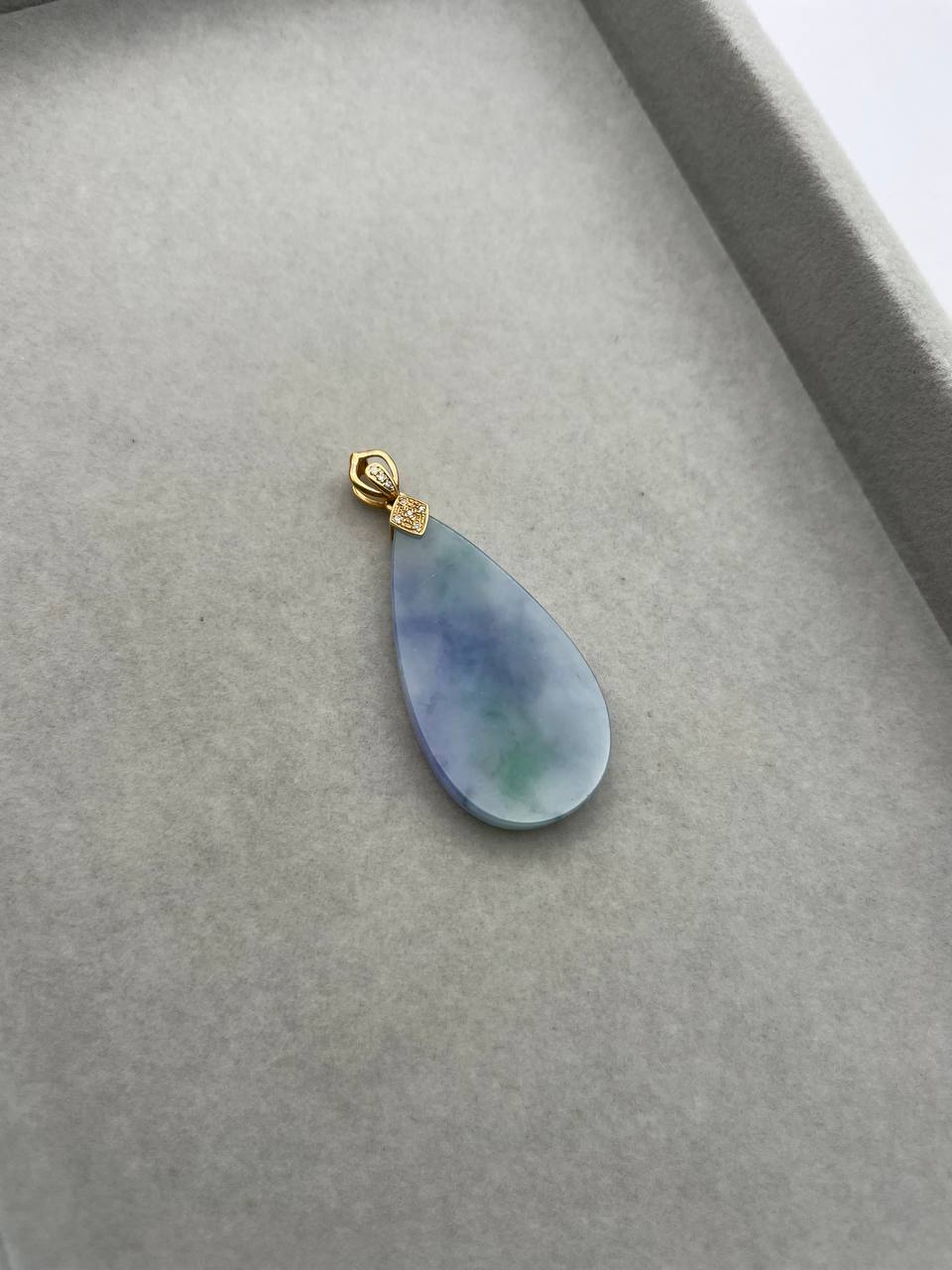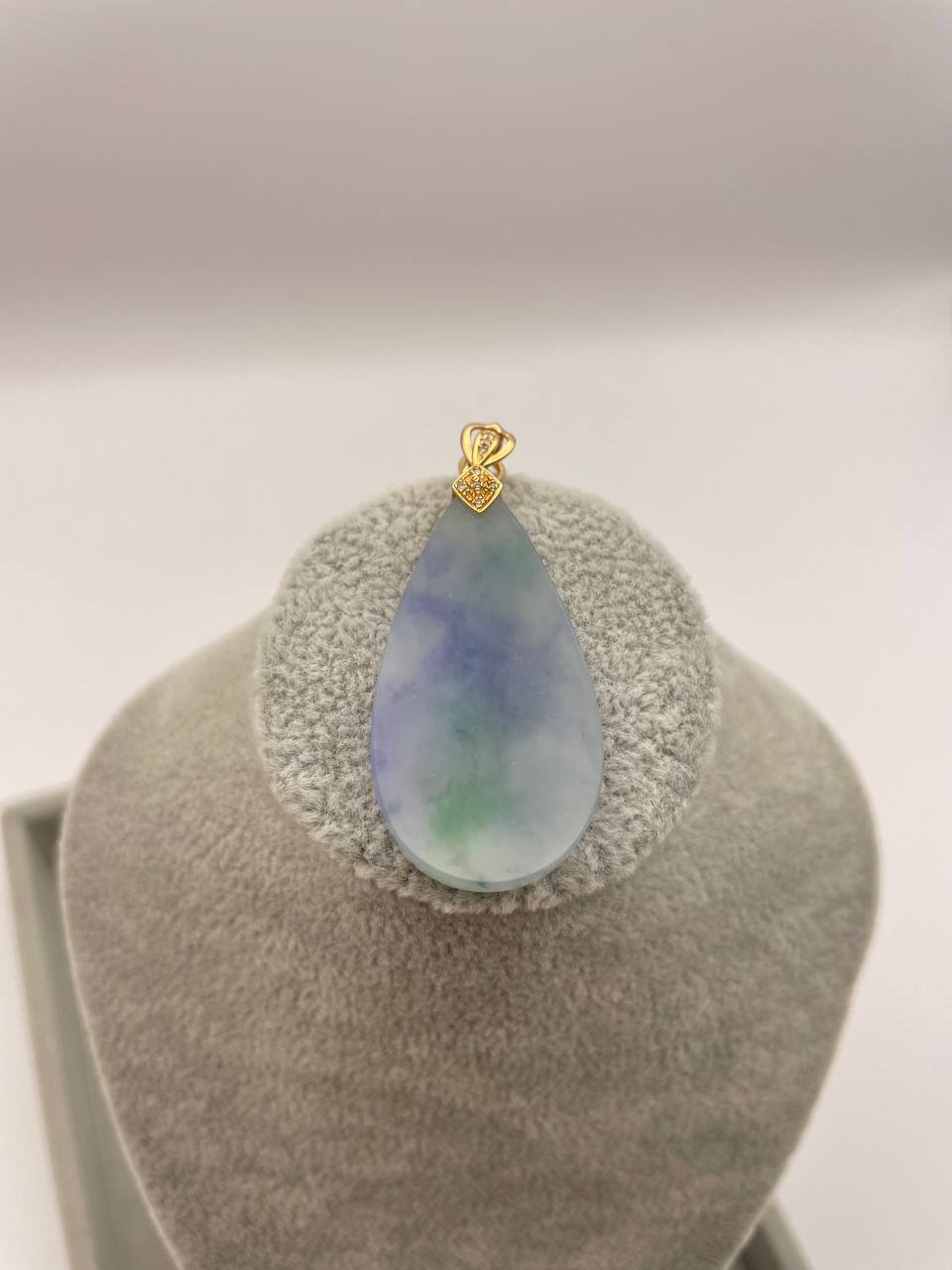 This particular one holds a distinguished hues of purples and strikes of bright green marbling with a 18k hook setting. (Chain not included). As if one is looking at a shrouded purple mist, this Wushi has its mysterious charm to it. The deep purple will definitely entice collectors who love the color purple. The last picture is taken under natural sunlight.