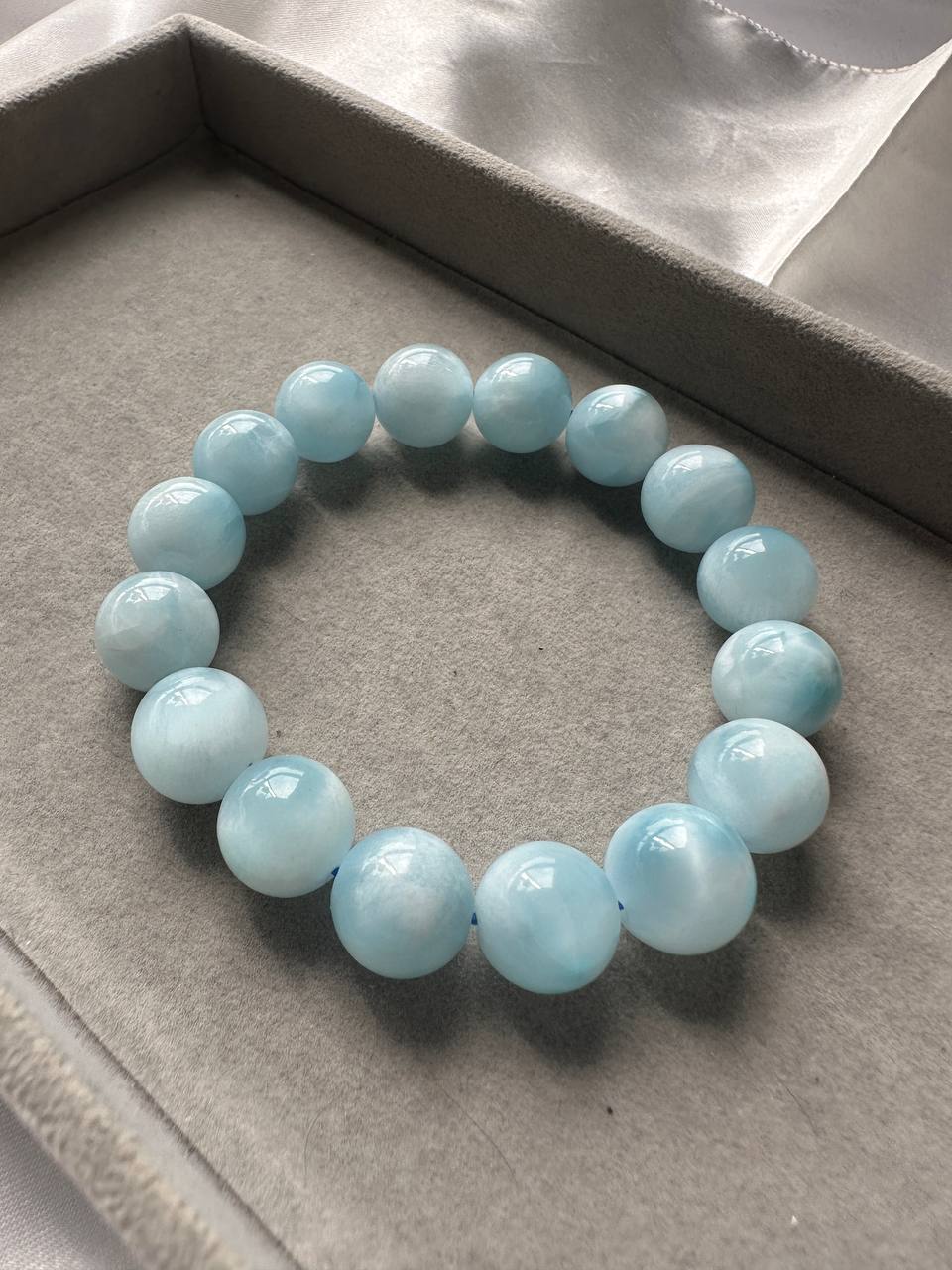 This Larimar beads bracelet is crystallised, this means that it has achieve a certain translucency while giving off a more baby blue in color. A beautiful piece with no major dark spots that can be found of the beads' surface.